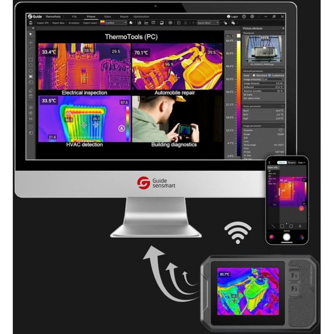 Guide Sensmart PF210 je kompaktní a robustní termokamera velikosti kapsy, navržená pro rychlou a přesnou diagnostiku v terénu. Díky vysokému rozlišení obrazového snímače, intuitivnímu dotykovému displeji a bezdrátovému připojení se hodí zejména pro techniky ve službách elektro, stavební inspekce, údržbu i facility management.
